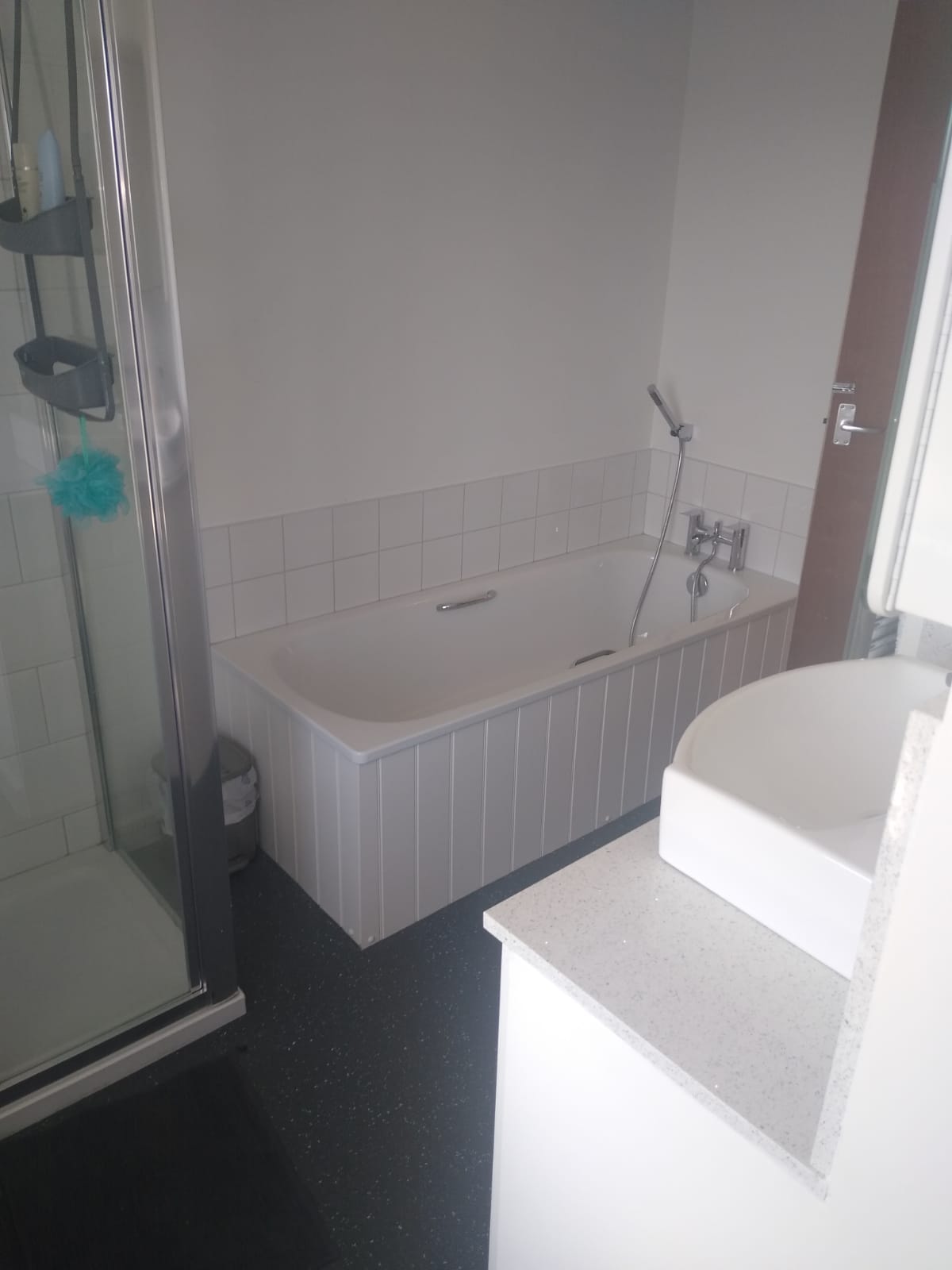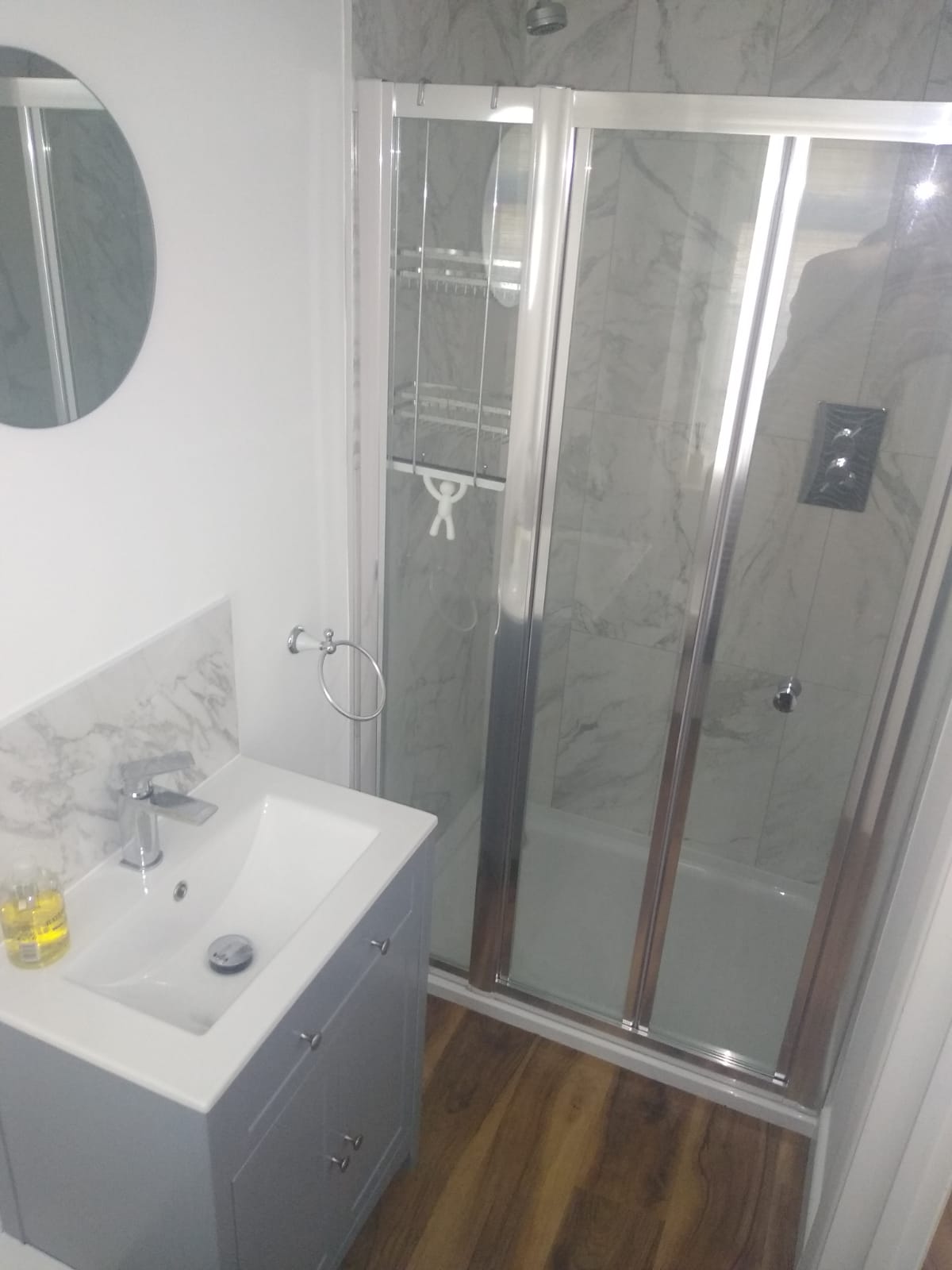 Two and a half bathrooms including a bath and two separate walk-in showers